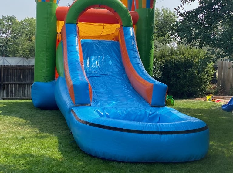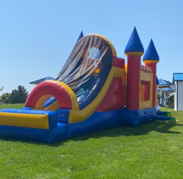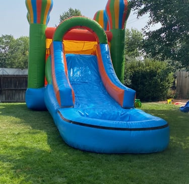 This combo unit is large, with a covered slide, you reach 16 feet tall. A 15' x 15' bounce area, this unit works well for large gatherings and teenage birthdays!